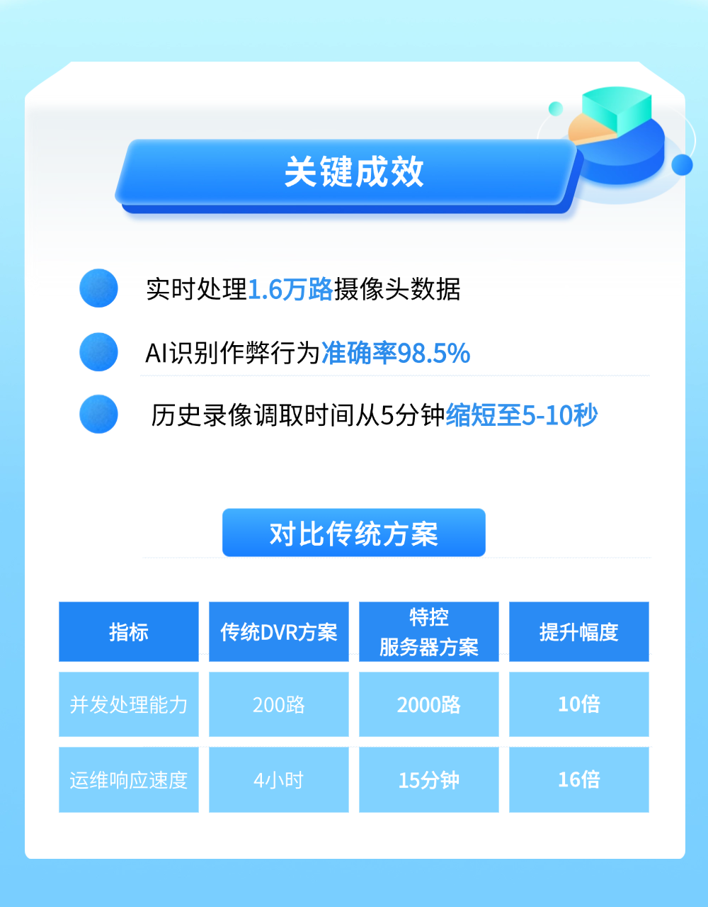 特控以雙路高性能服務器集群為核心,打造新一代智能監考系統,單臺設備即可實現: